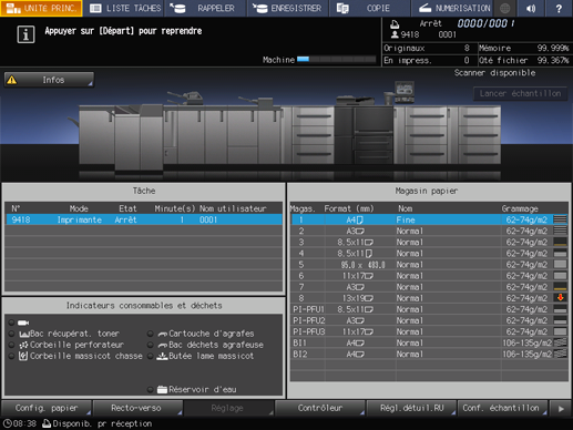 Quand le papier chargé dans le magasin spécifié pour les données d'impression reçues ne correspond pas aux conditions papier de la tâche, la machine s'arrête temporairement.