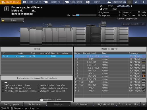 Quand le papier chargé dans le magasin spécifié pour les données d'impression reçues ne correspond pas aux conditions des données d'impression, la machine s'arrête temporairement.