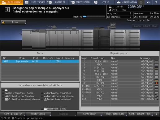 Le réglage papier du magasin sélectionné (sélection actuelle) et celui requis par les données d'impression (sélection réservée) sont affichés.