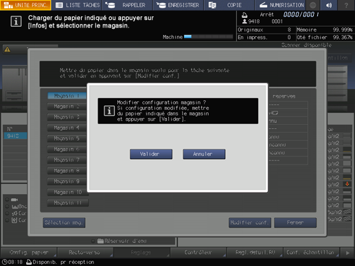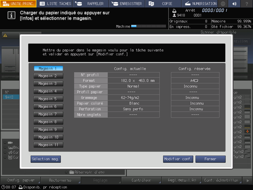 Lorsque le message affiché ne désigne pas un magasin spécifique, sélectionnez un magasin quelconque et remplacez sa configuration papier (sélection actuelle) par celle requise par les données d'impression (configuration réservée). Approvisionnez le magasin de papier conforme aux conditions spécifiées, puis lancez l'impression.