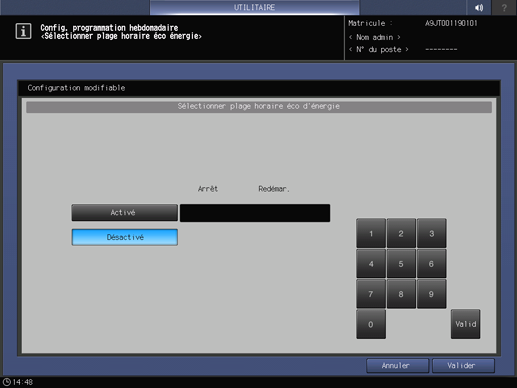 Appuyez consécutivement sur Configuration système sur l'écran Menu Réglage administrateur et appuyez sur Programmateur hebdomadaire et Plage horaire éco d'énergie.