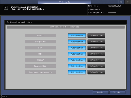 Appuyez consécutivement sur Configuration système, Autorisation/Interdiction et Conf.interd.numér.