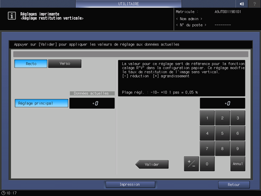 Cette opération est la même que celle effectuée dans Réglage - Réglage machine - Réglages imprimante - Restitution verticale, accessible sur l'écran UNITÉ PRINC.