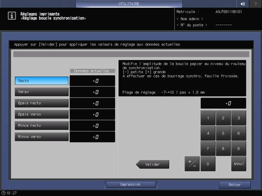 Appuyez sur Configuration système dans le Menu Réglage administrateur et appuyez consécutivement sur Réglages expert, Réglages imprimante et Boucle rouleau synchro.