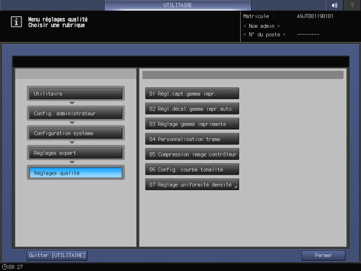 Appuyez sur Configuration système sur l'écran Menu Conf. administrateur. Appuyez successivement sur Réglages expert, Réglage qualité et Régl.décal.gamma imprim.auto.