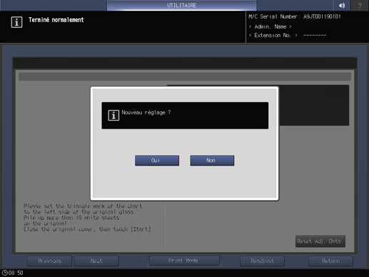 La machine ne déterminant pas l'efficience des données de réglage lors de la première numérisation, le message Terminé normalement n'est pas affiché. Répétez les étapes 6 à 9 jusqu'à l’affichage du message Terminé normalement.