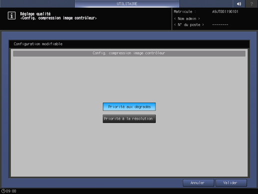 Appuyez sur l'onglet Configuration système de l'écran Menu Réglage administrateur et appuyez successivement sur Réglages expert, Réglage qualité et Compression image contrôleur.