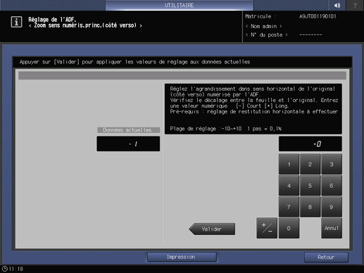 Appuyez sur l'onglet Configuration système de l'écran Menu fonctions administrateur et appuyez consécutivement sur Réglages expert, Réglage chargeur d'originaux et Zoom sens numér.princ. (ver).
