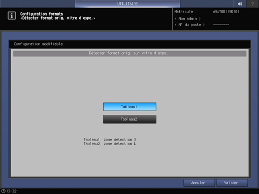 Appuyez sur l'onglet Configuration système de l'écran Menu Configuration administrateur et appuyez consécutivement sur Format et Détect format orig.sur vitre.