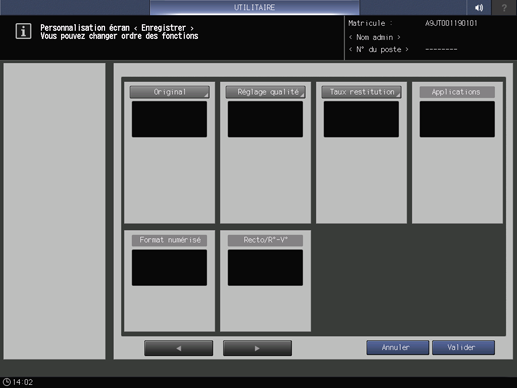 Appuyez sur l'onglet Configuration système de l'écran Menu fonctions administrateur et appuyez consécutivement sur Personnalisation écran et Conf.personn.écran enr.