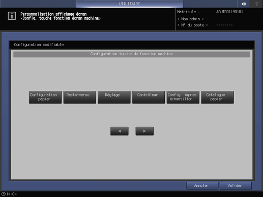 Appuyez consécutivement sur Configuration système sur l'écran Menu configuration administrateur et appuyez sur Personnalisation écran et Configuration touche de fonction machine.