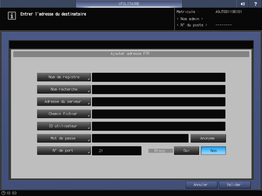 Mandataire | Indiquez si vous souhaitez utiliser un serveur proxy. Si la destination est un serveur externe, sélectionnez Oui. Pou utiliser un serveur proxy, vous devez faire le configurer les paramètres d'utilisation du serveur proxy sur l'écran UTILITAIRE. Pour en savoir plus, voir Configuration FTP et Configuration NIC. |