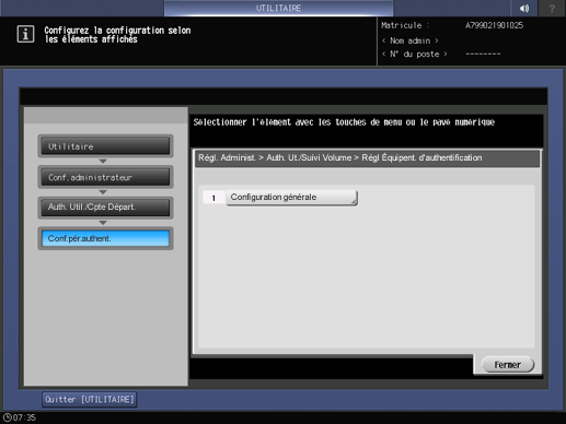 Appuyez successivement sur Auth. utilis./Compte Département, Config. périph. authent. et Configuration générale sur l'écran Menu Config. administrateur.