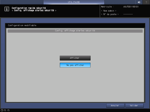 Appuyez sur l'onglet Configuration réseau sur l'écran Menu Réglage administrateur et appuyez successivement sur Conf.sécu.rapide et Affich.avertissmt.sécur.