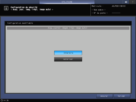 Sur l'écran Menu config. administrateur, appuyez successivement sur Configuration sécurité et Acq.jour.im. (image auto).