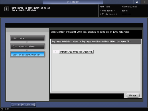Appuyez sur Gestion authent.Open API sur l'écran Menu Config. administrateur et appuyez sur Paramètres Code Restriction.