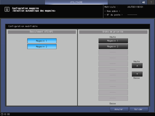 A l'aide des boutons situés sous Basculement ATS/APS, sélectionnez le magasin d'alimentation papier utilisé par la fonction APS et le magasin de remplacement pour la fonction ATS.