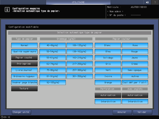 Appuyez consécutivement sur Configuration système sur l'écran Menu Réglage utilisateur et appuyez sur Configuration magasins et Sélection auto papier.
