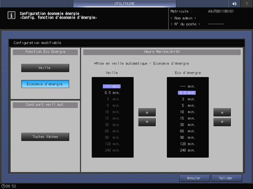 Appuyez consécutivement sur Configuration système sur l'écran Menu Réglage utilisateur et appuyez sur Réglage économie énergie et Réglage fonc. éco. éner.