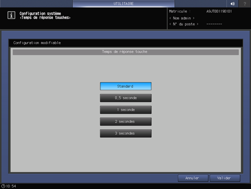 Sélectionnez l'intervalle de temps pour obtenir une réponse de la machine après avoir appuyé sur une touche ou un bouton de l'écran tactile ou du panneau de contrôle.