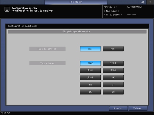 Spécifiez si vous souhaitez utiliser ou non un port de service (port USB). Sélectionnez aussi le type de clavier si le port de service est utilisé.
