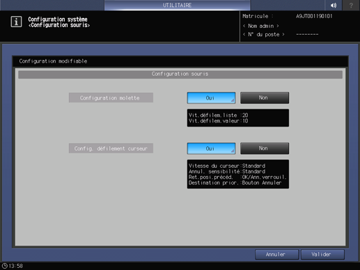 Appuyez sur l'onglet Configuration système de l'écran Menu Réglage utilisateur et appuyez sur Configuration souris.