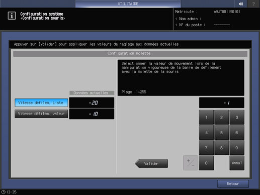 Vitesse défilem. valeur | Spécifiez la plage de saisie des valeurs avec la roulette de défilement. | Plage : 1 à 255 (Valeur par défaut : +10) |