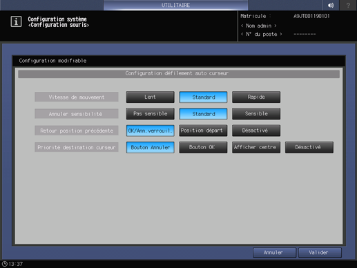 Priorité destination curseur | Place le curseur de la souris sur l'écran qui s'affiche. | Bouton Annuler, Bouton OK, Afficher centre, Désactivé |