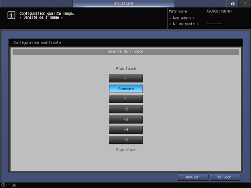 Appuyez sur Configuration qualité de l'écran Menu configuration utilisateur, puis appuyez sur Densité de l'image.