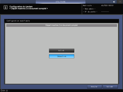 Appuyez sur Configuration du tandem sur l'écran Menu configuration utilisateur Menu, puis appuyez sur Départ mach.2 si doc.complet.