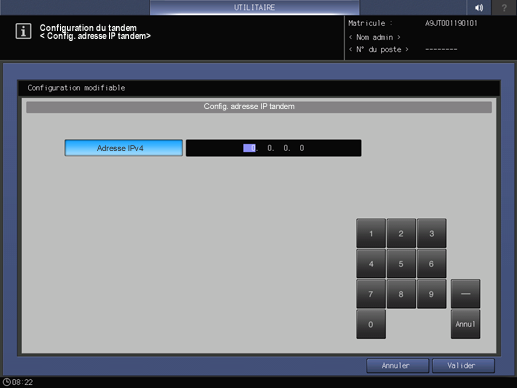 Appuyez sur Configuration du tandem dans l'écran Menu Configuration utilisateur et appuyez sur Config. adresse IP tandem.