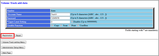 Explication supplémentairePour effacer les zones de texte, cliquez sur Reset. Pour annuler le nouvel enregistrement et revenir à la page précédente, cliquez sur la touche Back du navigateur web ou appuyez sur Volume Track setting Menu dans la fenêtre.