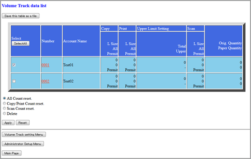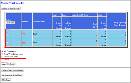 Explication supplémentaireCliquez sur les cases de l'écran Volume Track data list pour sélectionner les données de compte département du compteur à effacer. Cliquez sur la case d'option (cercle blanc) précédant le mode de réinitialisation souhaité.