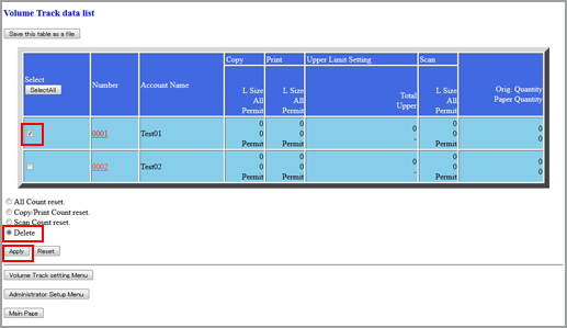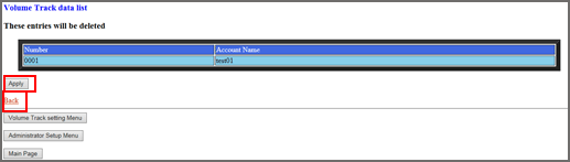 Explication supplémentaireCliquez sur les cases de l'écran Volume Track data list pour sélectionner les données de compte département à supprimer. Cliquez sur la case d'option Delete.
