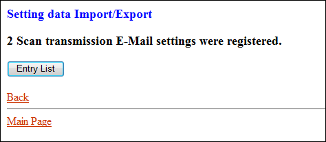 Ne pas cliquer sur Refresh sur le navigateur à ce stade. Cliquez sur Back. L'écran Setting data Import/Export réapparaît.