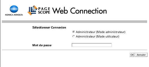 L'accès par PageScope Web Connection affiche l'écran de connexion lorsque l'authentification utilisateur ou compte département est activée et affiche l'écran de connexion en mode utilisateur public lorsque l'authentification utilisateur ou mode département n'est pas activée. Pour vous reconnecter à la machine en tant qu'utilisateur différent ou en tant qu’administrateur, vous devez d'abord vous déconnecter et vous reconnecter.