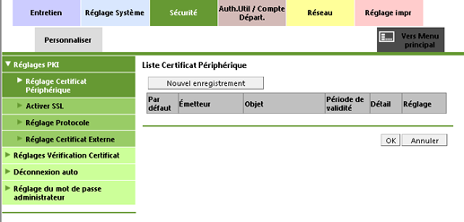 [Réglages PKI] | Spécifie les réglages des certificats. Spécifie les réglages des certificats périphérique, SSL, des certificats périphérique assignés à un protocole et des certificats externes. Pour en savoir plus, voir Réglage Certificat périphérique, Activer SSL, Réglage Protocole, ou Réglage Certificat externe. |