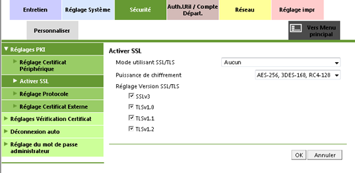 Pour afficher cet écran, cliquez sur [Réglages PKI] - [Activer SSL] dans le menu de l'onglet [Sécurité].