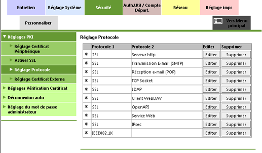 Pour afficher cet écran, cliquez sur [Réglages PKI] - [Réglage Protocole] dans le menu de l'onglet [Sécurité]. Cet écran n'est pas affiché sans l'installation de certificat SSL.