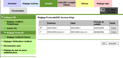 Cliquez sur [Détail] pour afficher les détails du certificat. La liste des certificats périphérique s'affiche. Cliquez sur [Retour] pour revenir à l'écran [Réglage Protocole].