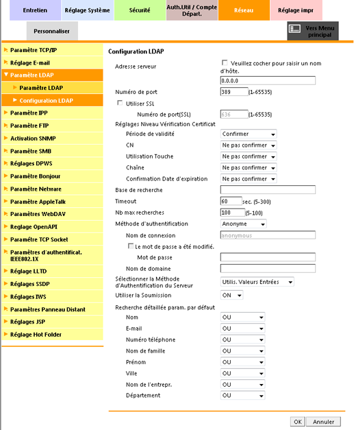 Pour afficher cet écran, cliquez sur [Paramètre LDAP] - [Configuration LDAP] dans le menu de l'onglet [Réseau].