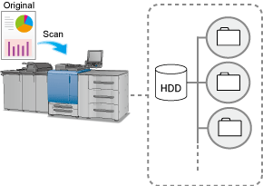 Vous pouvez enregistrer les données numérisées dans le chargeur ADF ou sur la vitre d'exposition de la machine (données de numérisation) dans une boîte utilisateur définie sur le disque dur.