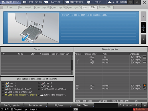 L'indicateur [Corbeille massicot chasse] dans la zone Indicateurs consommables et déchets de l'écran [UNITÉ PRINC.] s'allume en rouge et la couleur du texte devient jaune.