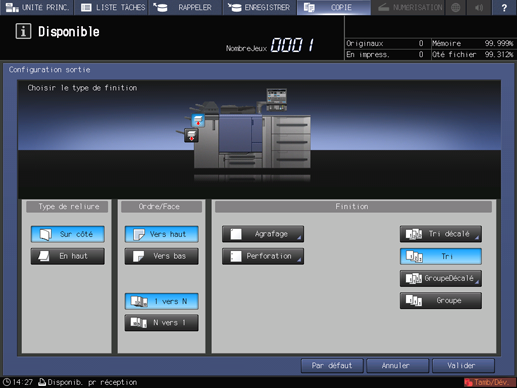L'image frontale de la machine représentée sur l'écran [Réglage sortie] montre que le bac principal est le bac de sortie sélectionné.