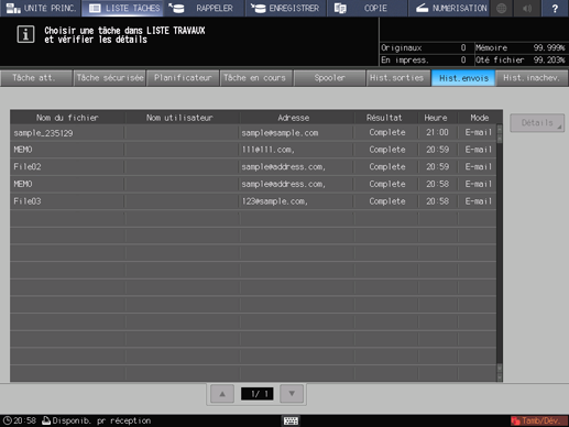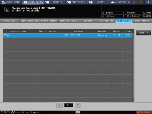 Pour afficher l'écran [LISTE TRAVAUX], appuyez sur l'onglet [LISTE TRAVAUX] et ensuite appuyez sur [Hist.envois].