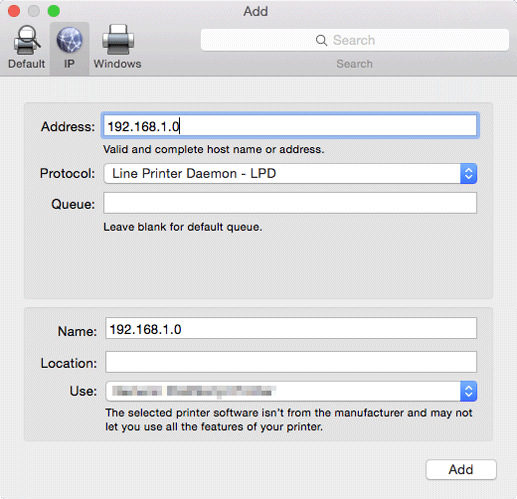 Dans [Address], entrez l'adresse IP de la machine. Dans [Queue], entrez "ipp".
