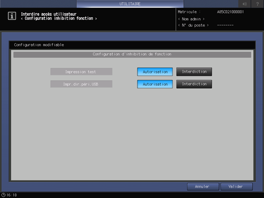 Appuyez sur [Configuration système] sur l'écran Menu Configuration administrateur] et appuyez successivement sur [Autorisation/Interdiction] et sur [Configuration d'inhibition de fonction].