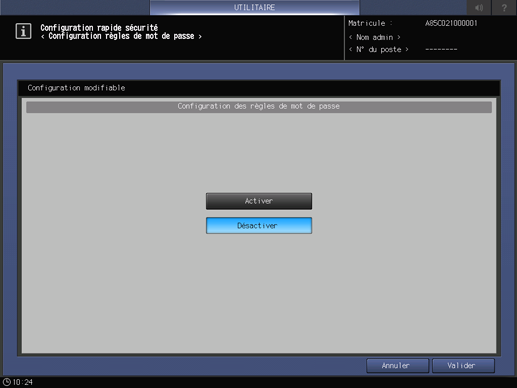 Ce réglage est le même que celui de [Conf.sécu.rapide] - [Configuration des règles de mot de passe] accessible de l'écran [UTILITAIRE].