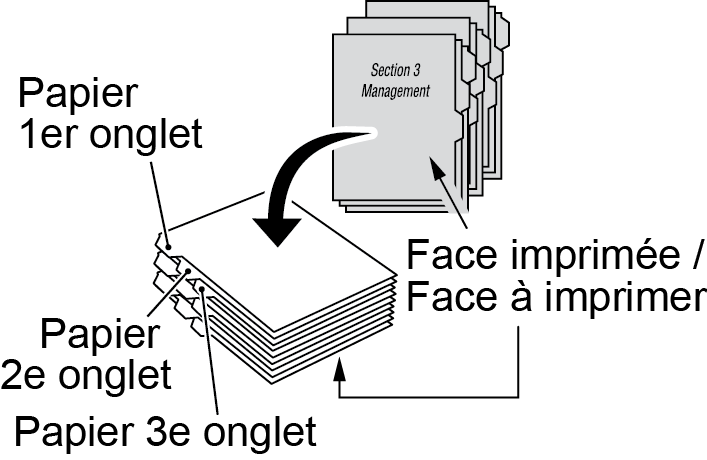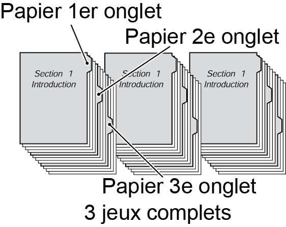 Exemple : 3 feuilles de papier à onglet sont insérées dans chacun des 3 jeux de finition (un total de 9 feuilles de papier à onglet)