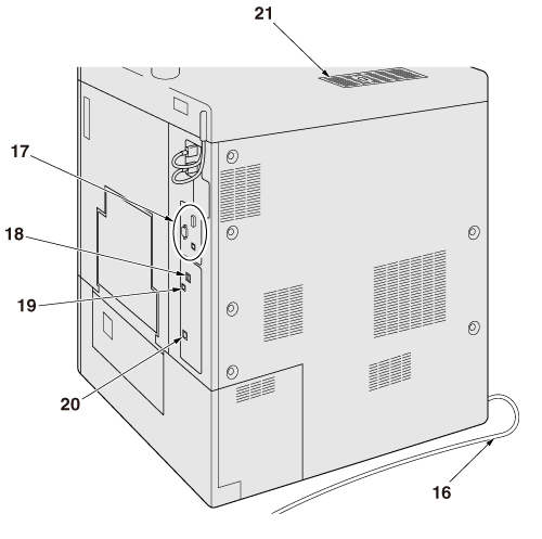 20 | Port réseau (10Base-T, 100Base-TX, 1000Base-T) | Reçoit un câble Ethernet pour utiliser la machine, ou se servir de la machine comme imprimante/scanner réseau. |